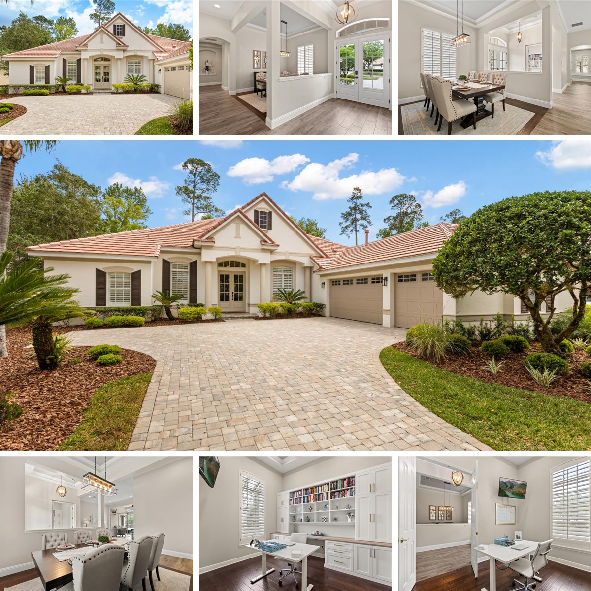 Welcome to this stunning golf-front home in the highly sought-after guard-gated Alaqua Lakes Community! Situated on the 7th fairway, this beautiful home boasts a fantastic open floor plan with breathtaking views of the golf course and the pool. As you step through the brand-new glass entry doors, you are immediately greeted by serene outdoor views through the large sliding doors filled with abundant natural light. To the right of the entryway, you will find a formal dining room perfect for entertaining guests, while a private workspace on the left features custom built-ins that offer both storage and stylish display options and additional counter space for work. The seamless flow continues into the living room, which opens to the kitchen and spacious family room. The home's three-way split plan provides maximum privacy and convenience. The luxurious owner's retreat is on the left side of the home and features a cozy sitting area along with his and hers California custom walk-in closets. The spa-inspired master bath includes a walk-in shower and a freestanding tub. The kitchen is a chef's dream, showcasing white cabinetry, a large granite island with bar seating, a custom-built pantry, and an inviting eat-in nook. The living room, family room, and bonus room/flex space all open to an expansive lanai, creating a perfect indoor-outdoor space. Outside the screened lanai is additional space with a fire pit area. Two additional bedrooms are positioned at the back right of the home. These bedrooms are adjacent to the bonus room/flex space and share an updated full bathroom, making them ideal for family and guests. On the opposite side of the kitchen, two bedrooms share a Jack and Jill bath, a powder room, and a dedicated laundry room leading to the three-car garage with brand new doors.